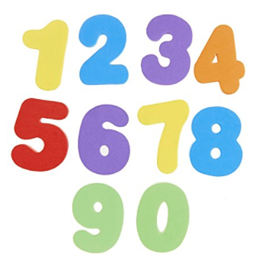 These bathtub numbers and letters stick to the walls of the bathtub when they are wet. The foam is soft, durable, and non-toxic. The manufacturer recommends ages 3+, but under close parent supervision, I can see younger toddlers having them. I wouldn’t recommend them for babies and really young toddlers as they may chew off pieces. Use your best judgment.