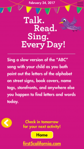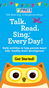 First 5 California also just launched an app for parents named Talk. Read. Sing.® so you can use the resources whenever you have your mobile device with you. If we’re eating out, we now have some activities to do while we’re waiting for food. I also love the prompts on the app when we’re going for a walk or going shopping. It’s another way to run errands while also helping my child learn.